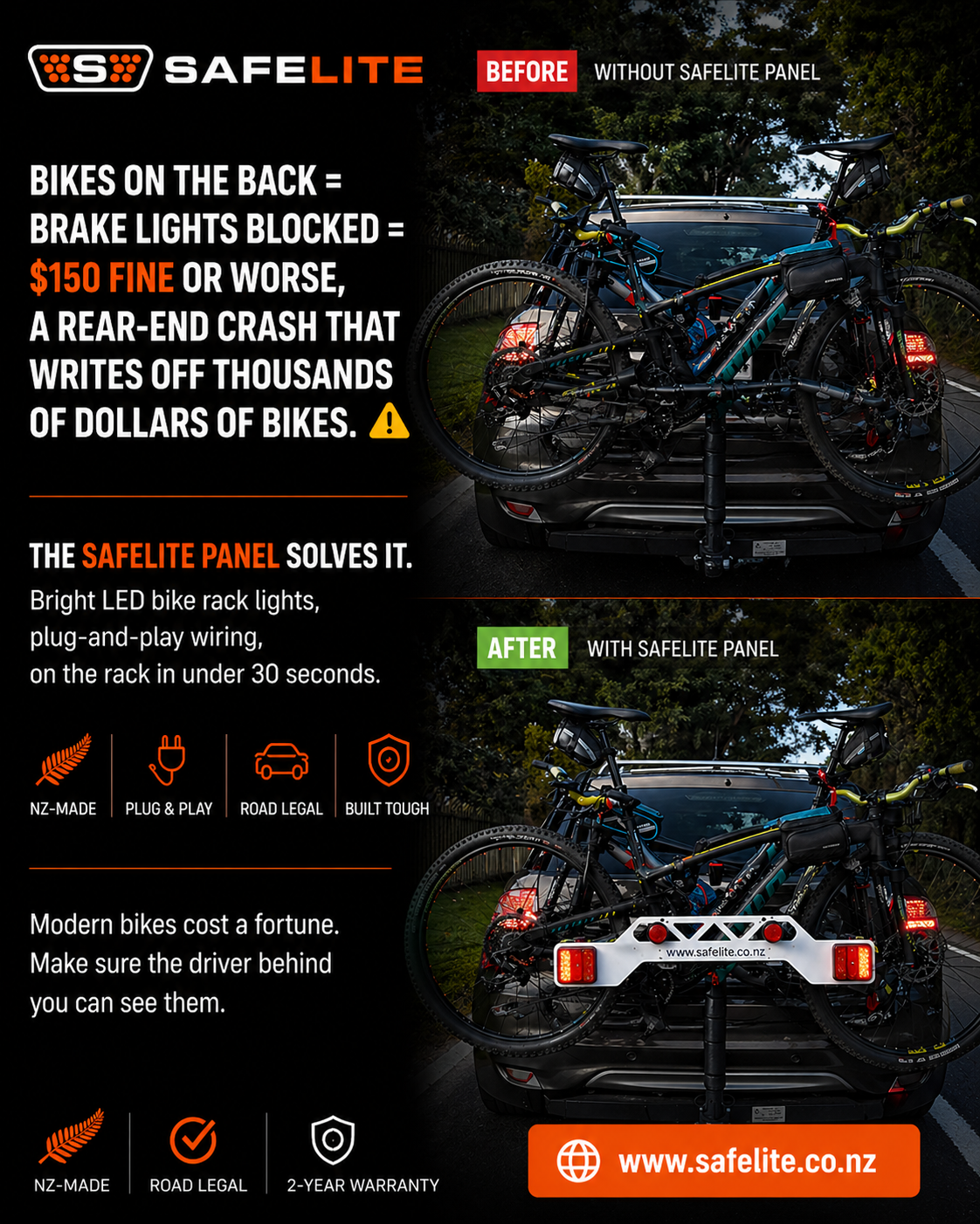 As you drive around Australia, you will see lots of decent Kiwi folks using bike racks and carrying bikes on cars but breaking the law. More importantly, they are putting themselves and their families at risk as they don’t have bike rack lights.